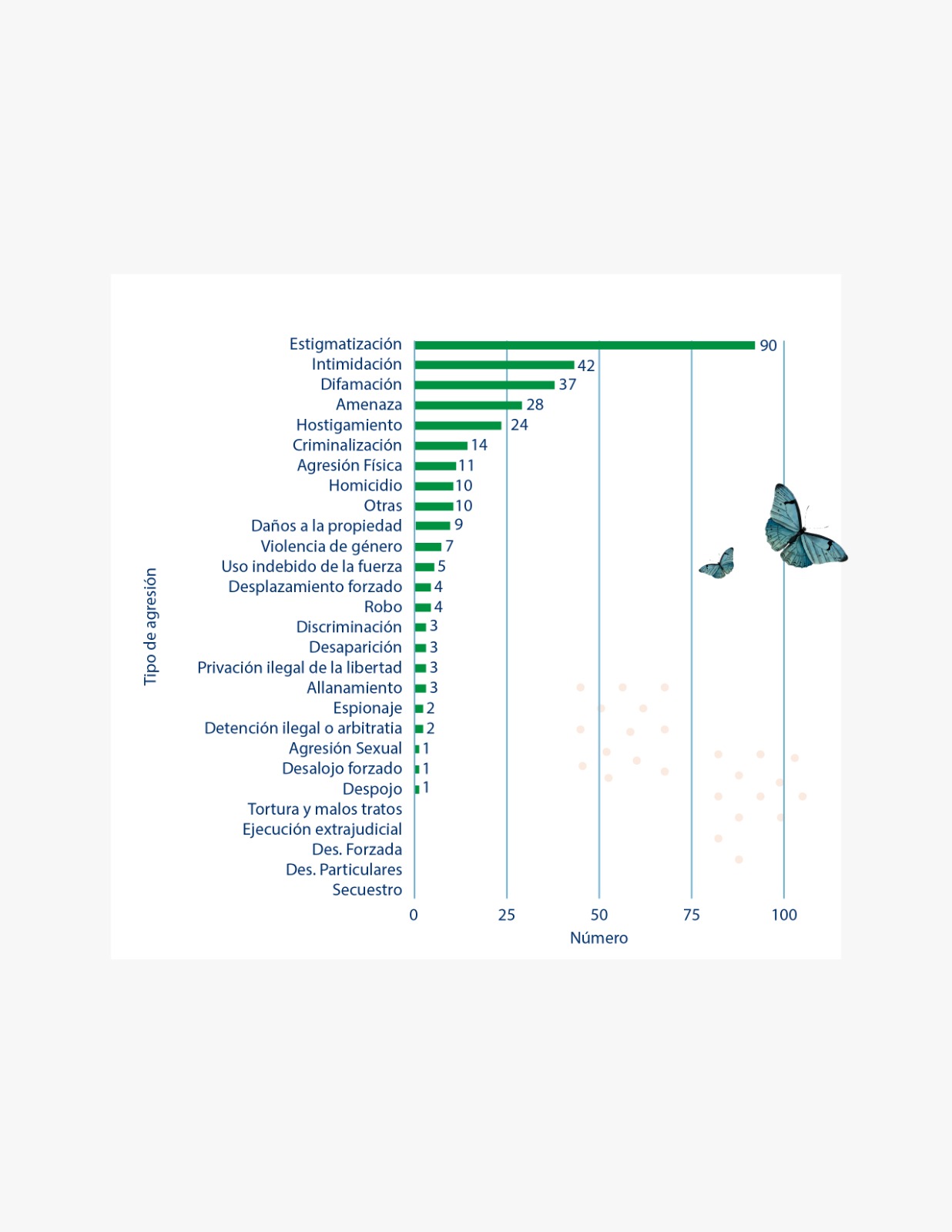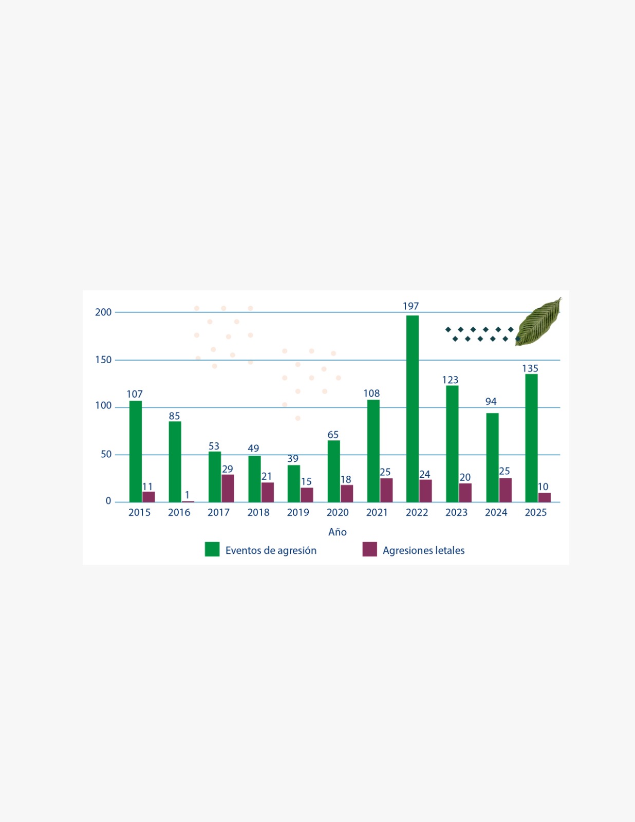Más allá de los asesinatos, el informe documenta 135 eventos de agresión y 314 agresiones específicas contra personas defensoras durante 2025, lo que refleja la amplitud del fenómeno.